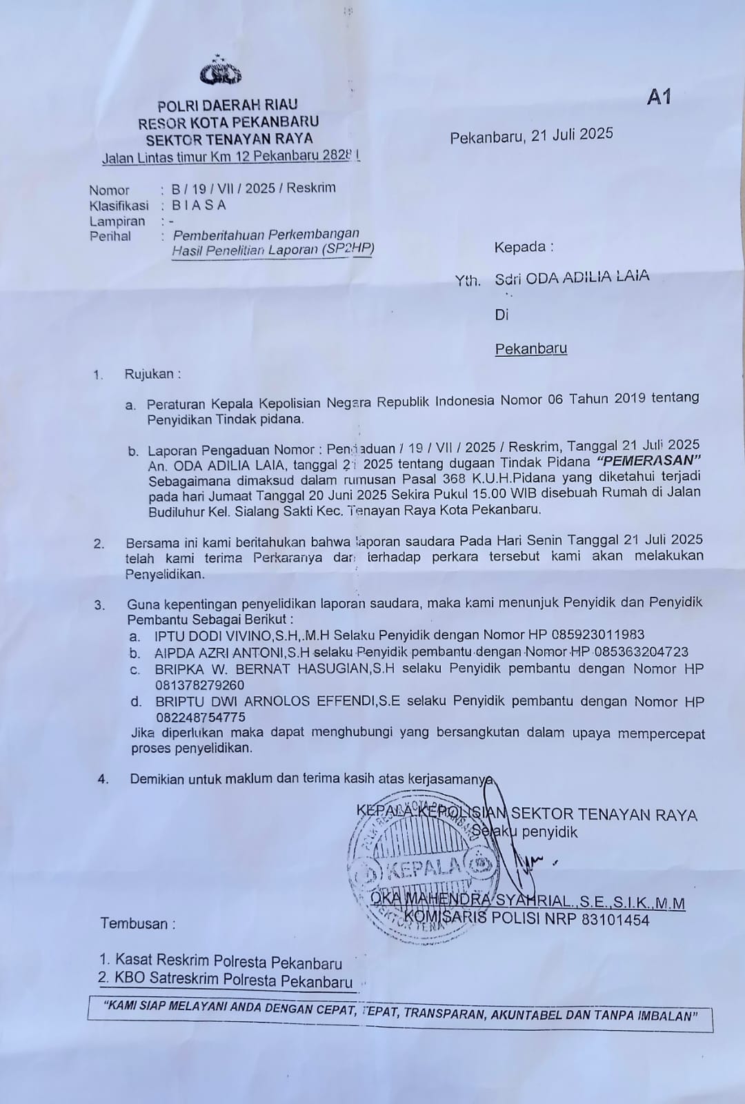 PEKANBARU, HARIANBERANTAS– Tepat pada hari Rabu siang, 10 September 2025, Pemimpin Redaksi Harian Berantas ini menerima surat dalam bentuk Pdf via WhatssApp dengan perihal Hak Koreksi dan Hak Jawab Atas Pemberitaan atas nama Waonasokhi Giawa terduga pelaku pemerasan terhadap salah seorang janda bernama Oda Adilia Laia, sebagaimana bukti Surat Tanda Penerimaan Laporan Polisi bernomor STPLP/19VII/2025/POLSEK TENAYAN RAYA Tanggal 21 Juli 2025.