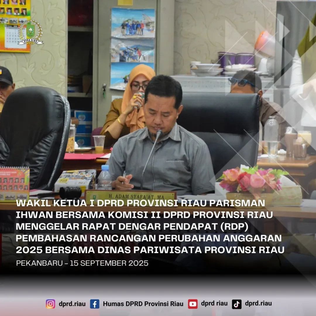 PEKANBARU, HARIANBERANTAS- Wakil Ketua DPRD Provinsi Riau, Parisman Ihwan, bersama Komisi II DPRD Provinsi Riau menggelar Rapat Dengar Pendapat (RDP) pembahasan Rancangan Perubahan Anggaran Tahun Anggaran 2025 bersama Dinas Pariwisata Provinsi Riau, di Ruang Rapat Komisi II DPRD Provinsi Riau, Senin (15/9/2025).